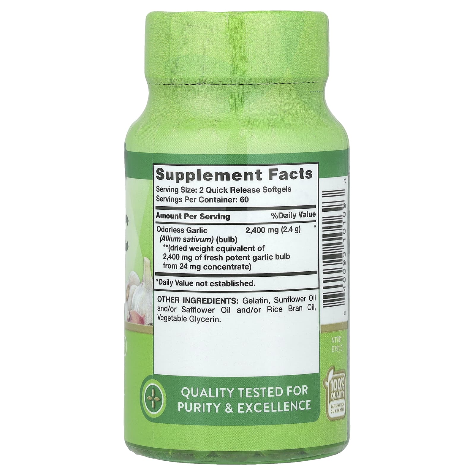 *Some information on the Nature's Truth, Odorless Garlic, 2,400 mg, 120 Quick Release Softgels (1,200 mg per Softgel)label may be missing, or it may have been written incorrectly. We work hard to keep the information accurate & up to date. Please let us know if you discover any errors.