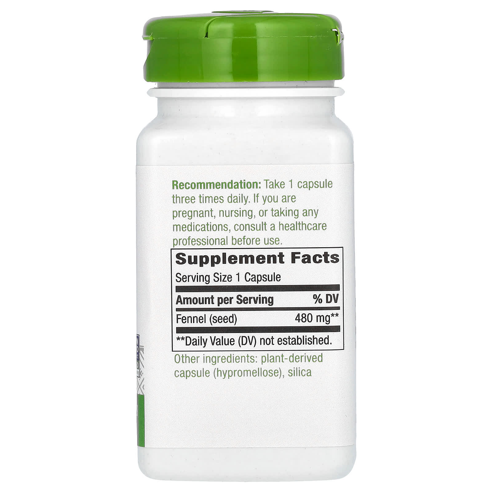 *Some information on the Nature's Way, Fennel Seed, 480 mg, 100 Vegan Capsuleslabel may be missing, or it may have been written incorrectly. We work hard to keep the information accurate & up to date. Please let us know if you discover any errors.