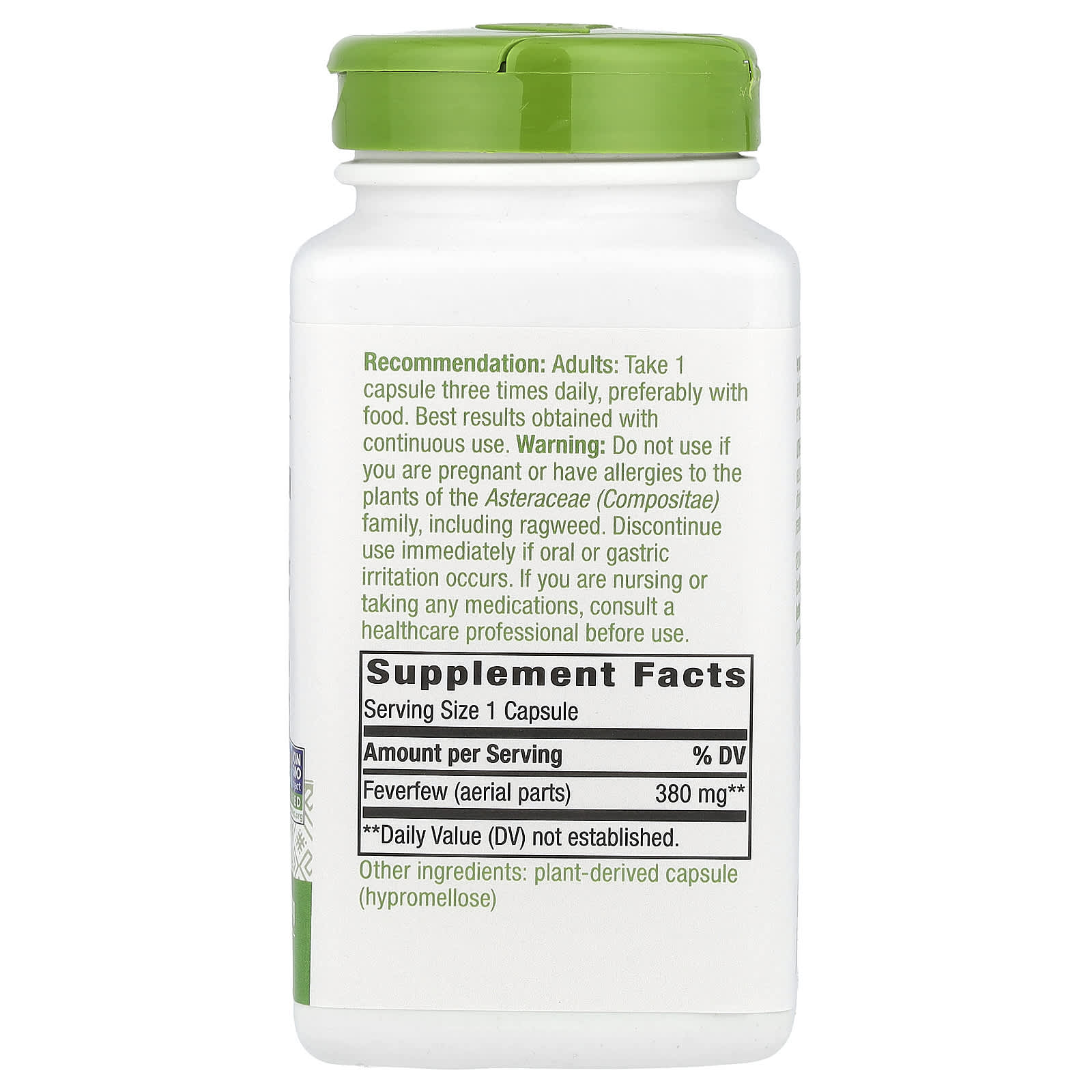 *Some information on the Nature's Way, Feverfew Herb, 380 mg, 180 Vegan Capsuleslabel may be missing, or it may have been written incorrectly. We work hard to keep the information accurate & up to date. Please let us know if you discover any errors.
