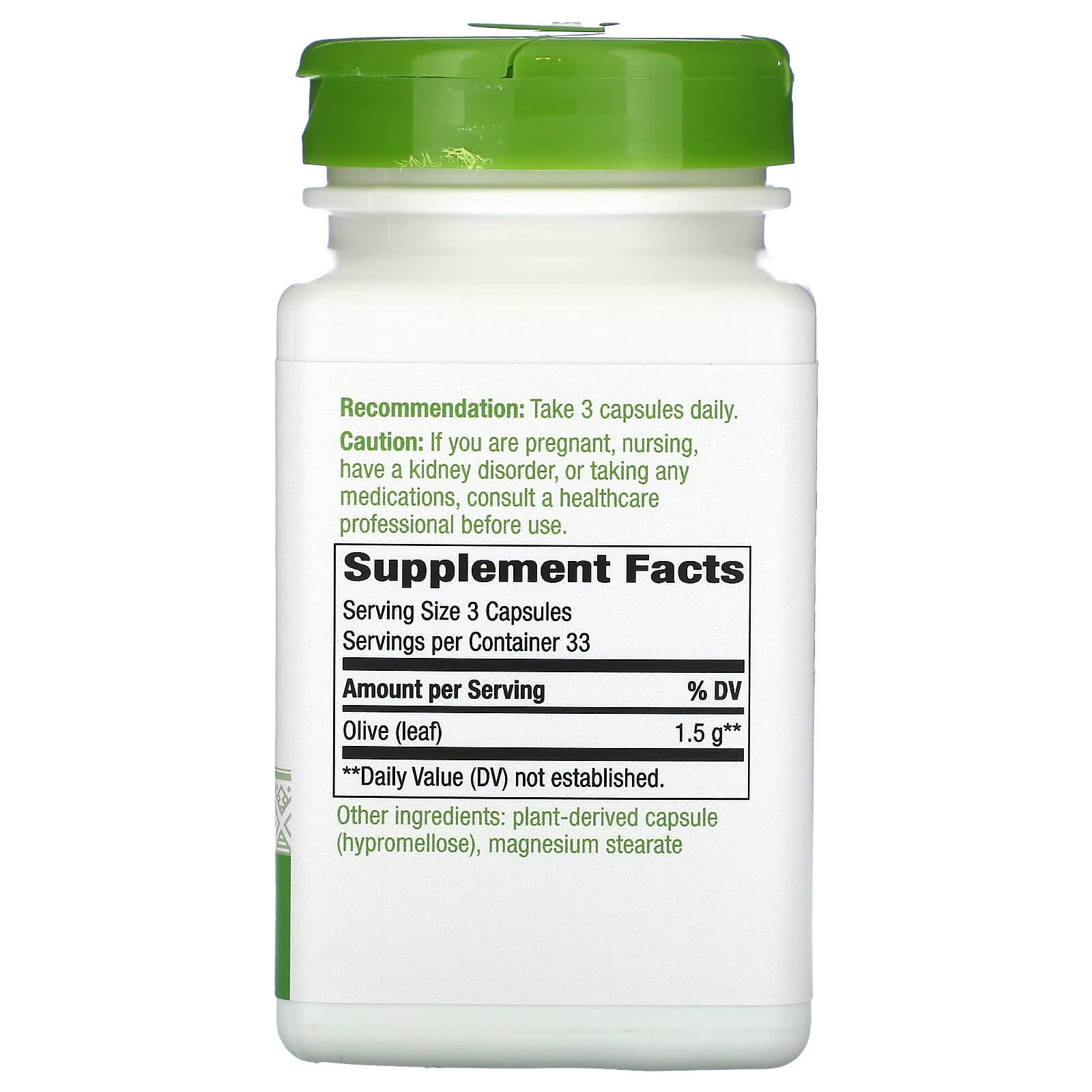 *Some information on the Nature's Way, Olive Leaf, 1,500 mg, 100 Vegan Capsules (500 mg per Capsule)label may be missing, or it may have been written incorrectly. We work hard to keep the information accurate & up to date. Please let us know if you discover any errors.
