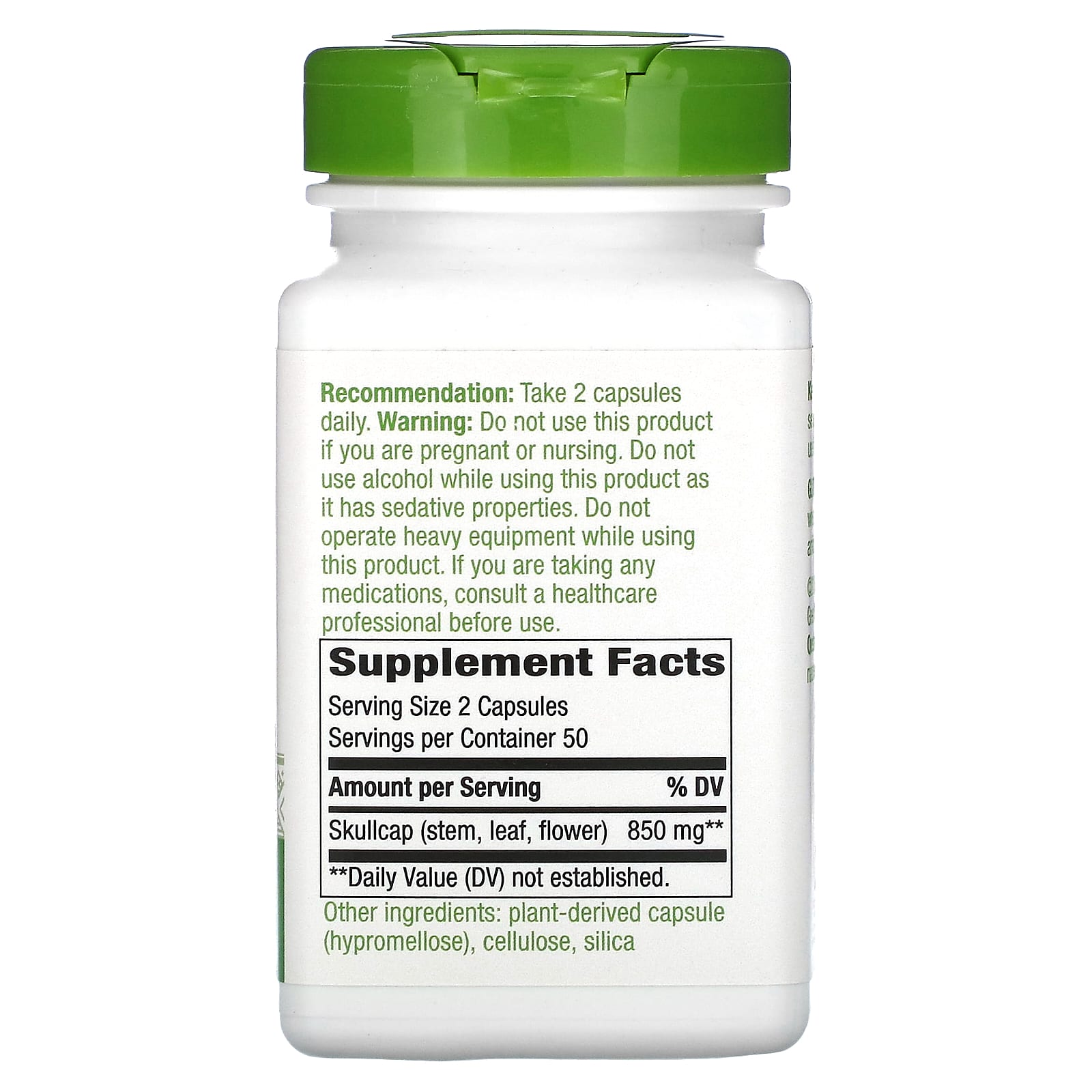 *Some information on the Nature's Way, Skullcap Herb, 850 mg, 100 Vegan Capsules (425 mg per Capsule)label may be missing, or it may have been written incorrectly. We work hard to keep the information accurate & up to date. Please let us know if you discover any errors.