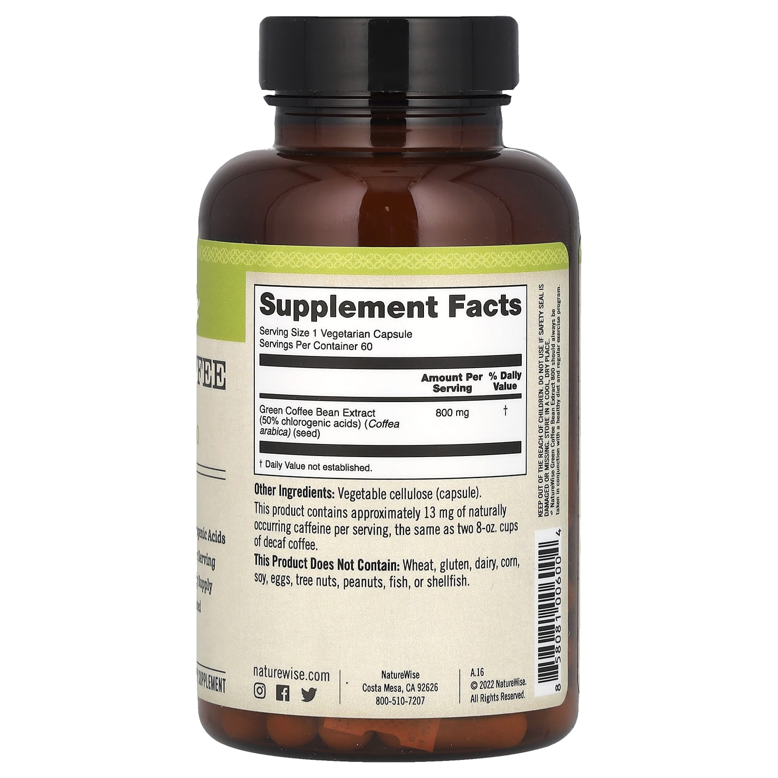 *Some information on the NatureWise, Green Coffee Bean Extract 800, 800 mg, 60 Vegetarian Capsuleslabel may be missing, or it may have been written incorrectly. We work hard to keep the information accurate & up to date. Please let us know if you discover any errors.