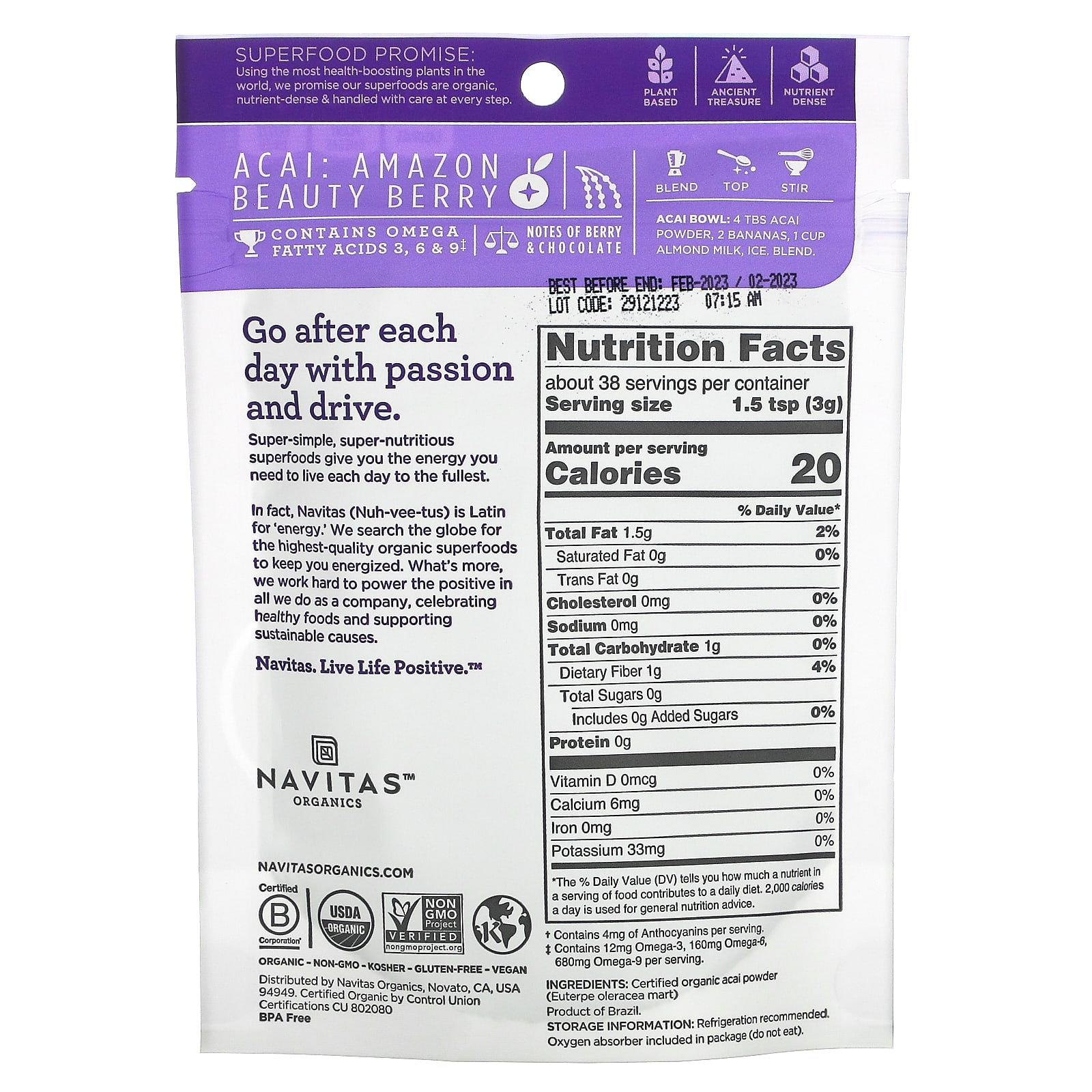 *Some information on the Navitas Organics, Organic Acai Powder, 4 oz (113 g)label may be missing, or it may have been written incorrectly. We work hard to keep the information accurate & up to date. Please let us know if you discover any errors.