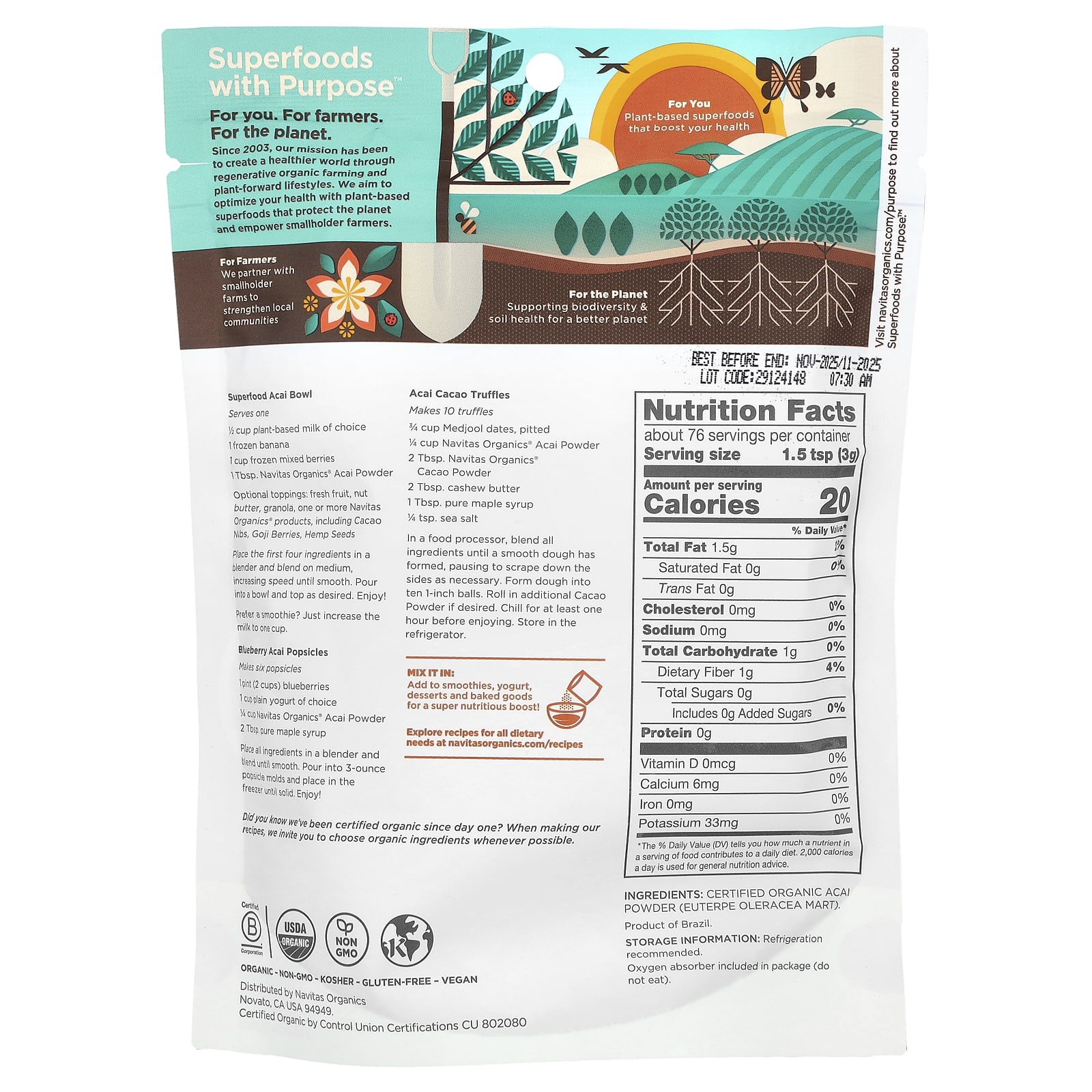 *Some information on the Navitas Organics, Organic Acai Powder, 8 oz (227 g)label may be missing, or it may have been written incorrectly. We work hard to keep the information accurate & up to date. Please let us know if you discover any errors.