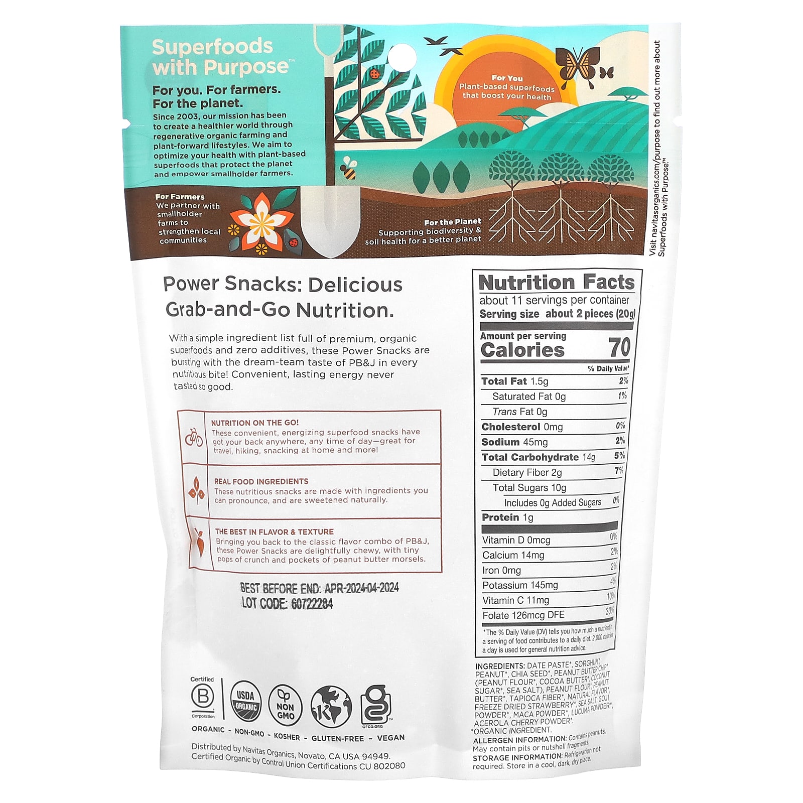 *Some information on the Navitas Organics, Organic Power Snacks, Superfood PB&J, 8 oz (227 g)label may be missing, or it may have been written incorrectly. We work hard to keep the information accurate & up to date. Please let us know if you discover any errors.