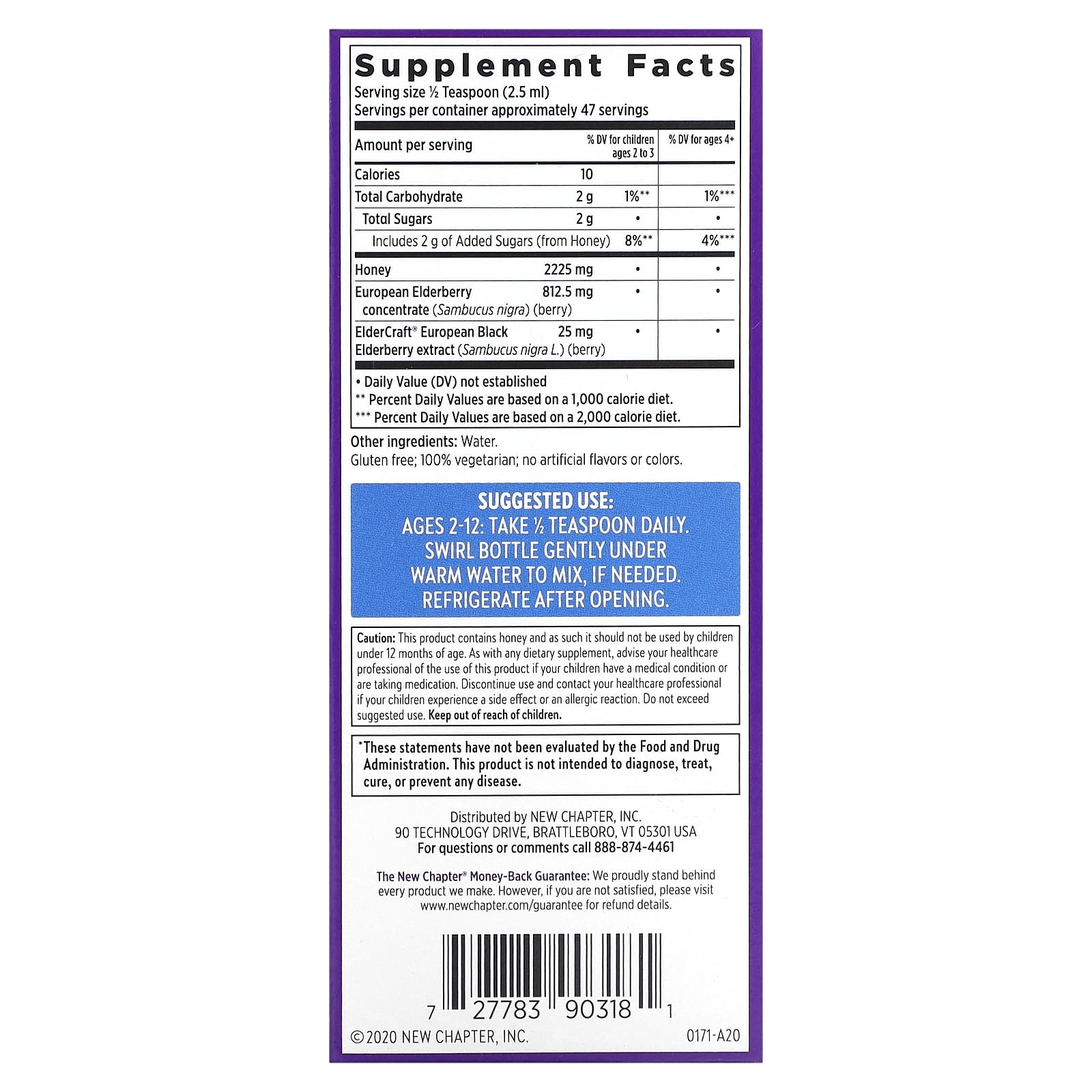 *Some information on the New Chapter, Kids, Elderberry Syrup + Honey, Ages 2+, 4 fl oz (118 ml)label may be missing, or it may have been written incorrectly. We work hard to keep the information accurate & up to date. Please let us know if you discover any errors.
