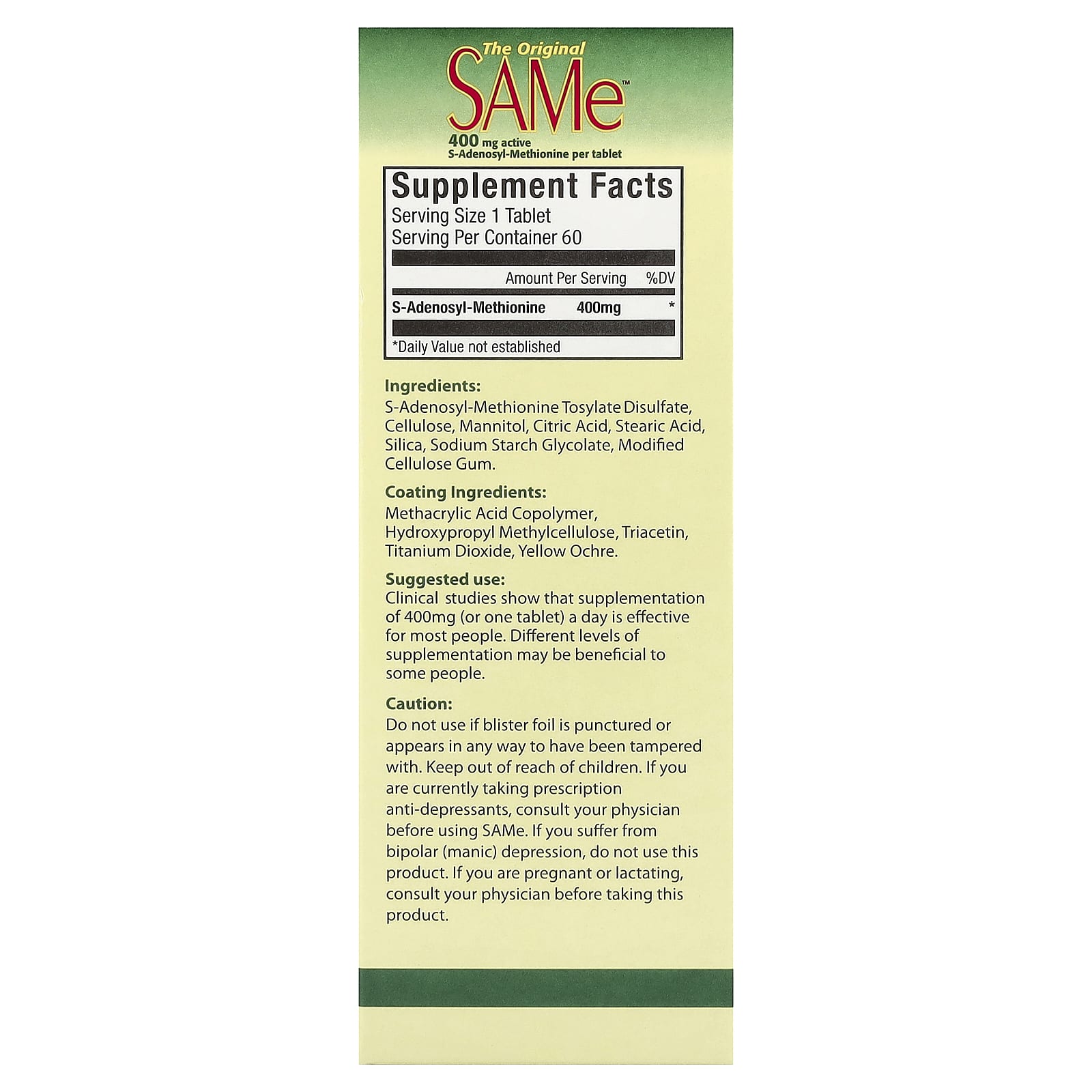 *Some information on the NutraLife, The Original SAMe™, S-Adenosyl-Methionine, 400 mg, 60 Enteric Coated Tabletslabel may be missing, or it may have been written incorrectly. We work hard to keep the information accurate & up to date. Please let us know if you discover any errors.
