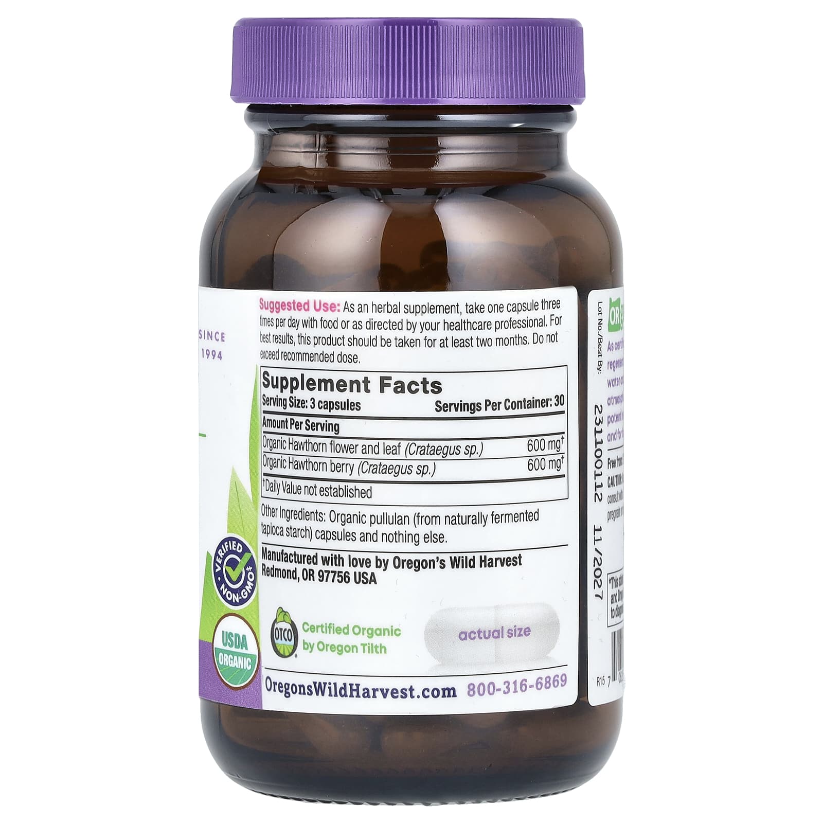 *Some information on the Oregon's Wild Harvest, Organic Hawthorn, 90 Vegan Capsuleslabel may be missing, or it may have been written incorrectly. We work hard to keep the information accurate & up to date. Please let us know if you discover any errors.