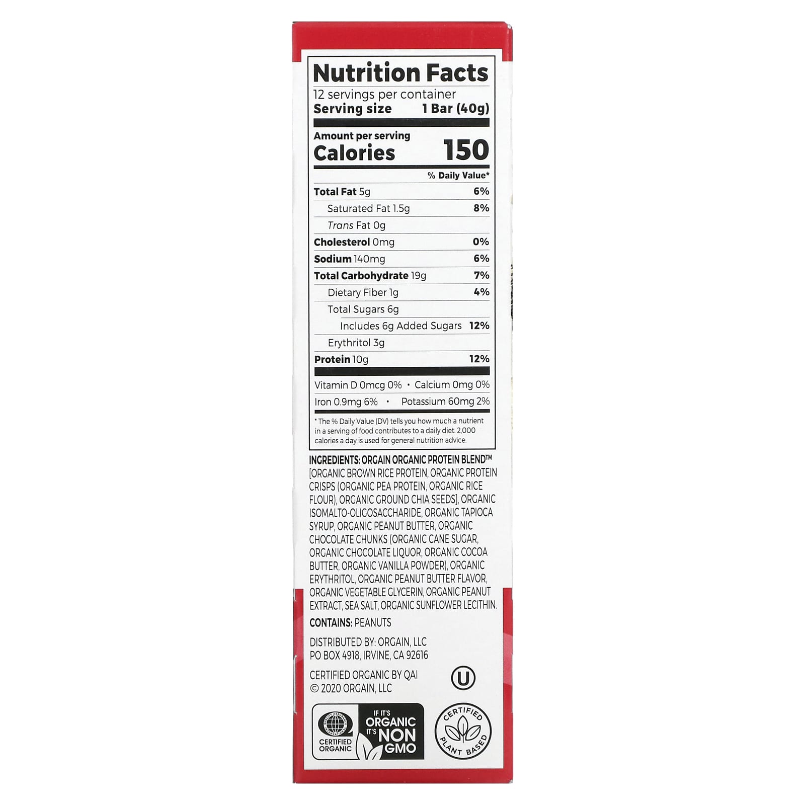 *Some information on the Orgain, Organic Plant-Based Protein Bar, Peanut Butter Chocolate Chunk, 12 Bars, 1.41 oz (40 g) Eachlabel may be missing, or it may have been written incorrectly. We work hard to keep the information accurate & up to date. Please let us know if you discover any errors.