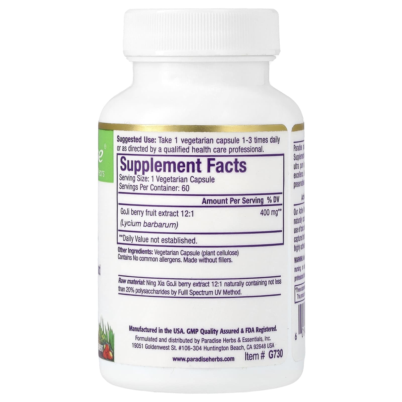 *Some information on the Paradise Herbs, Goji, 60 Vegetarian Capsuleslabel may be missing, or it may have been written incorrectly. We work hard to keep the information accurate & up to date. Please let us know if you discover any errors.