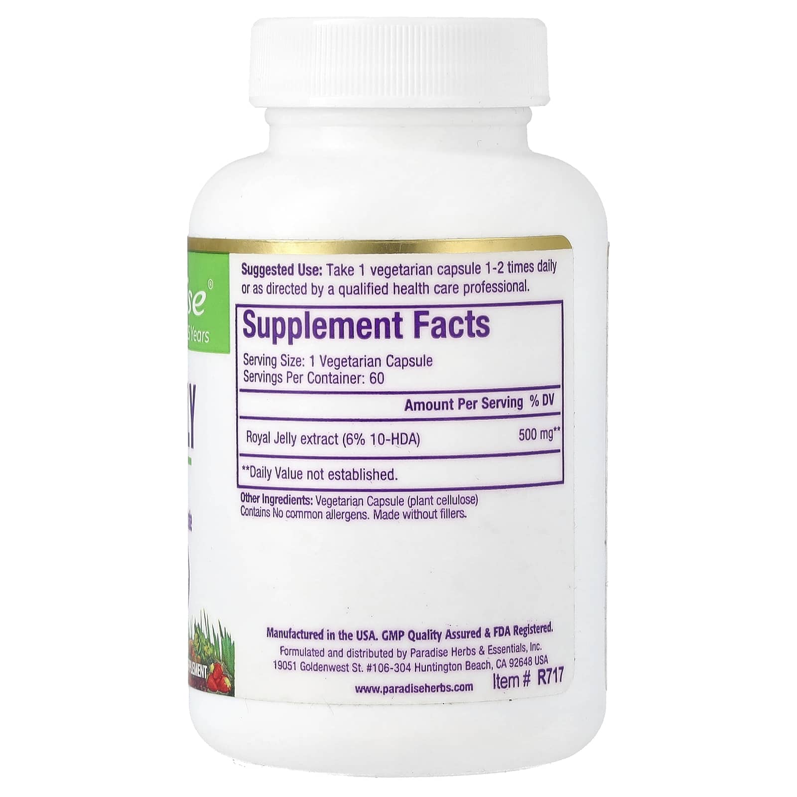 *Some information on the Paradise Herbs, Royal Jelly, 60 Vegetarian Capsuleslabel may be missing, or it may have been written incorrectly. We work hard to keep the information accurate & up to date. Please let us know if you discover any errors.