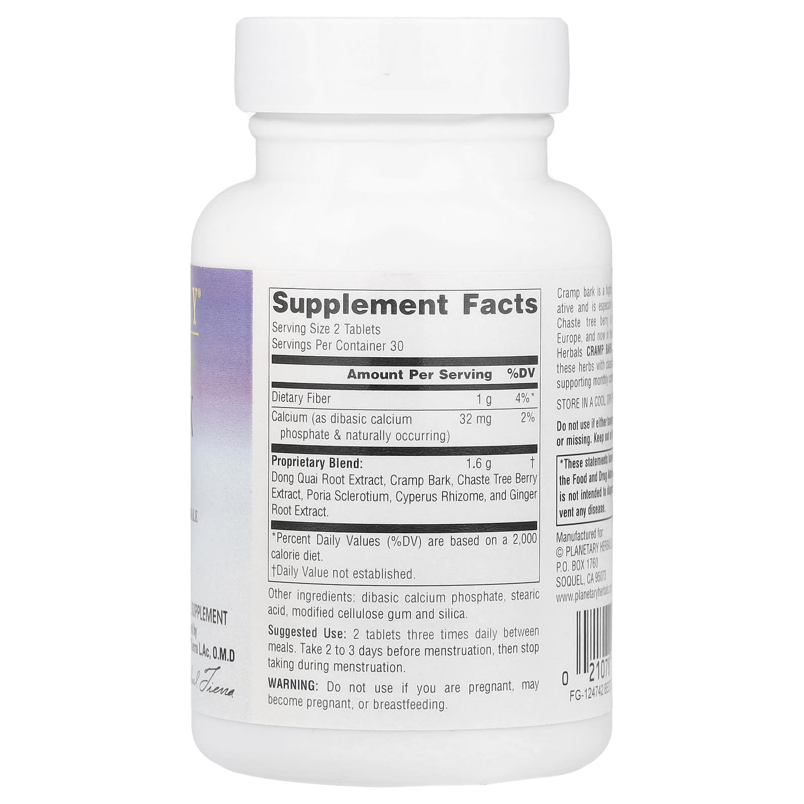 *Some information on the Planetary Herbals, Cramp Bark Comfort™, 800 mg, 60 Tablets (400 mg per Tablet)label may be missing, or it may have been written incorrectly. We work hard to keep the information accurate & up to date. Please let us know if you discover any errors.