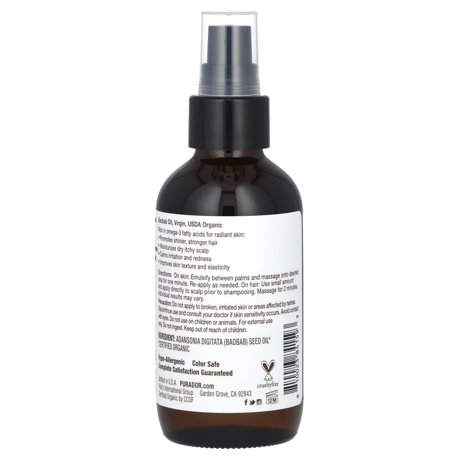 *Some information on the Pura D'or, Organic Baobab Oil, 4 fl oz (118 ml)label may be missing, or it may have been written incorrectly. We work hard to keep the information accurate & up to date. Please let us know if you discover any errors.