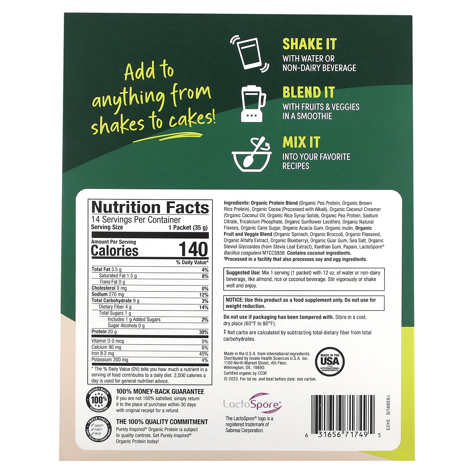 *Some information on the Purely Inspired, Organic Plant-Based Protein Powder, Rich Decadent Chocolate, 14 Single Serve Packets, 1.23 oz (35 g) Eachlabel may be missing, or it may have been written incorrectly. We work hard to keep the information accurate & up to date. Please let us know if you discover any errors.