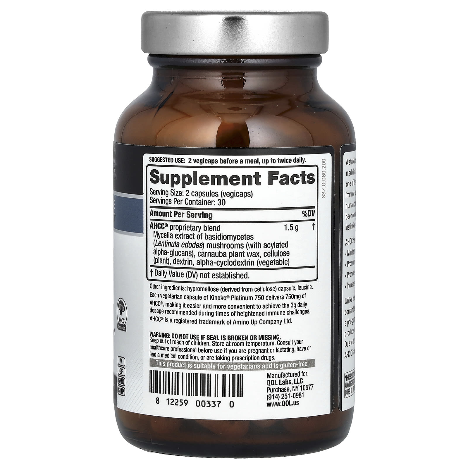 *Some information on the Quality of Life, Kinoko Platinum AHCC, 60 Vegicapslabel may be missing, or it may have been written incorrectly. We work hard to keep the information accurate & up to date. Please let us know if you discover any errors.