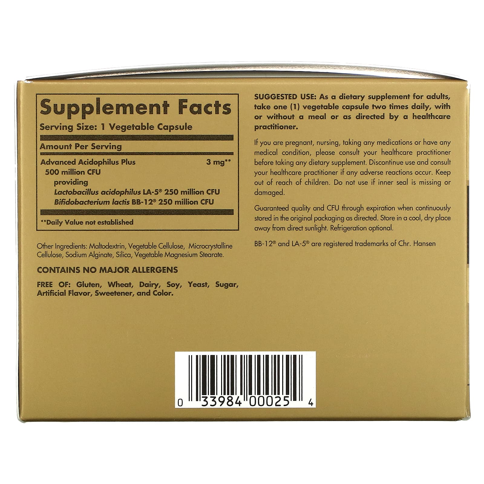 *Some information on the Solgar, Advanced Acidophilus Plus, 120 Vegetable Capsuleslabel may be missing, or it may have been written incorrectly. We work hard to keep the information accurate & up to date. Please let us know if you discover any errors.