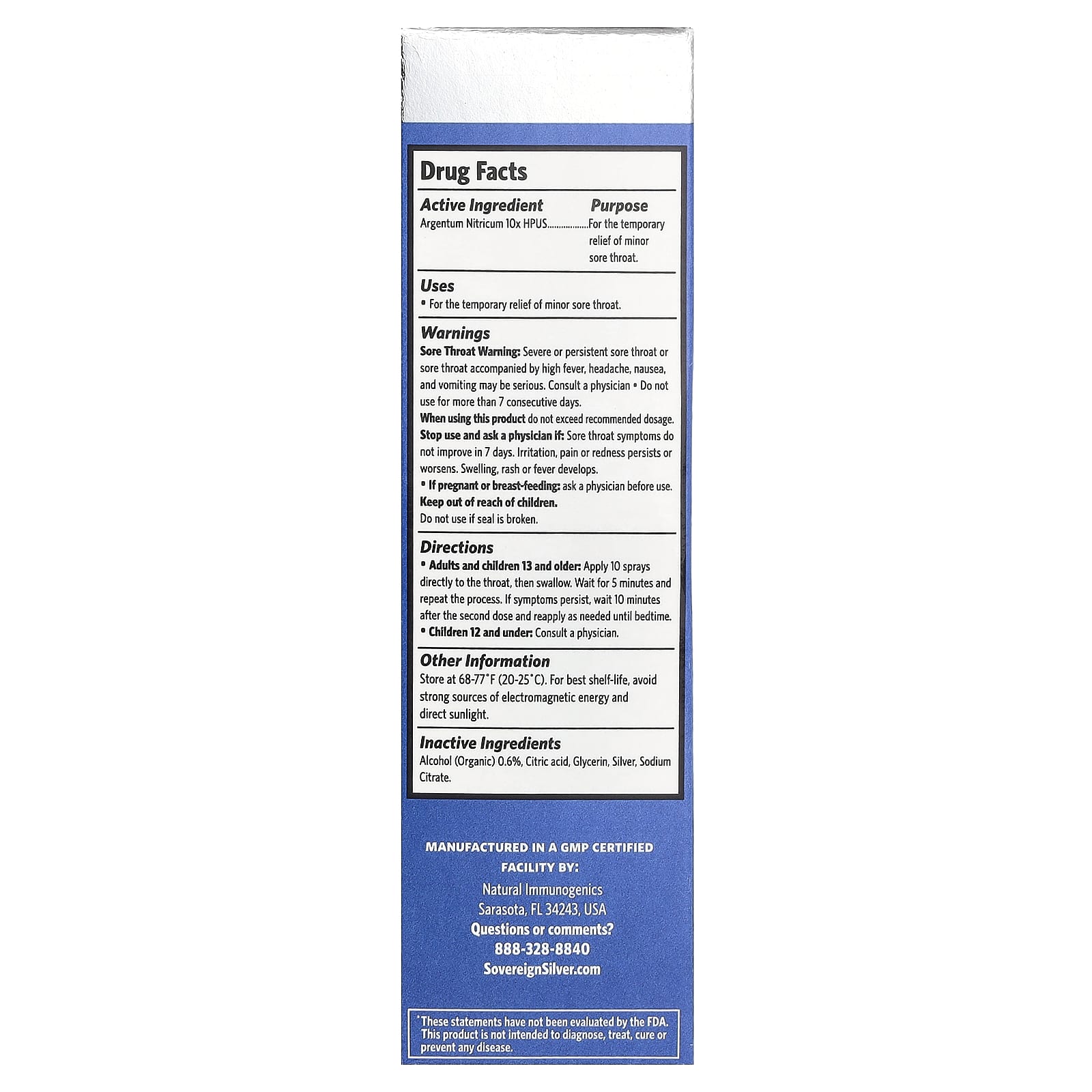 *Some information on the Sovereign Silver, Multi-Symptom Sore Throat Spray, 1 fl oz (29 ml)label may be missing, or it may have been written incorrectly. We work hard to keep the information accurate & up to date. Please let us know if you discover any errors.