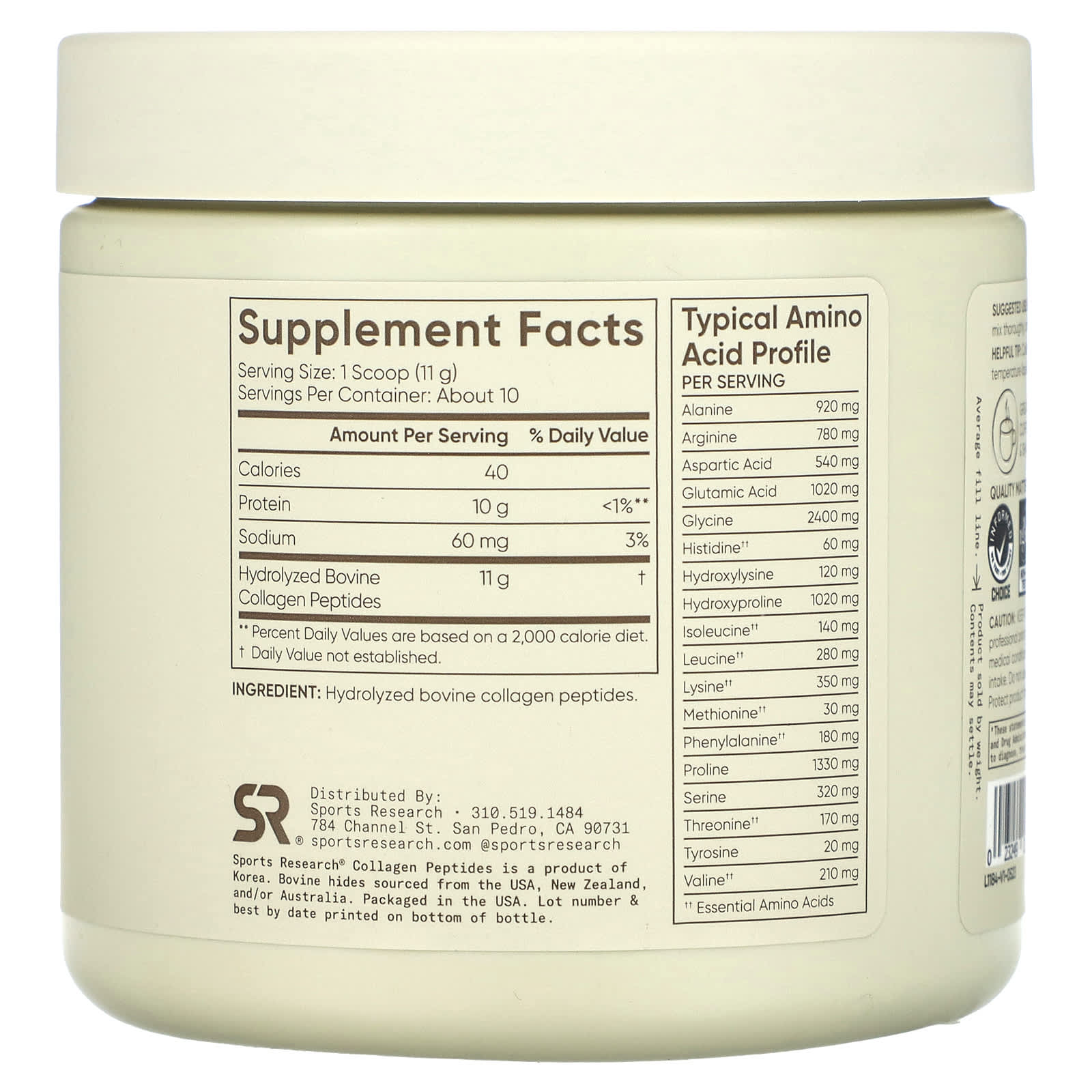 *Some information on the Sports Research, Collagen Peptides, Unflavored, 3.9 oz (110.6 g)label may be missing, or it may have been written incorrectly. We work hard to keep the information accurate & up to date. Please let us know if you discover any errors.