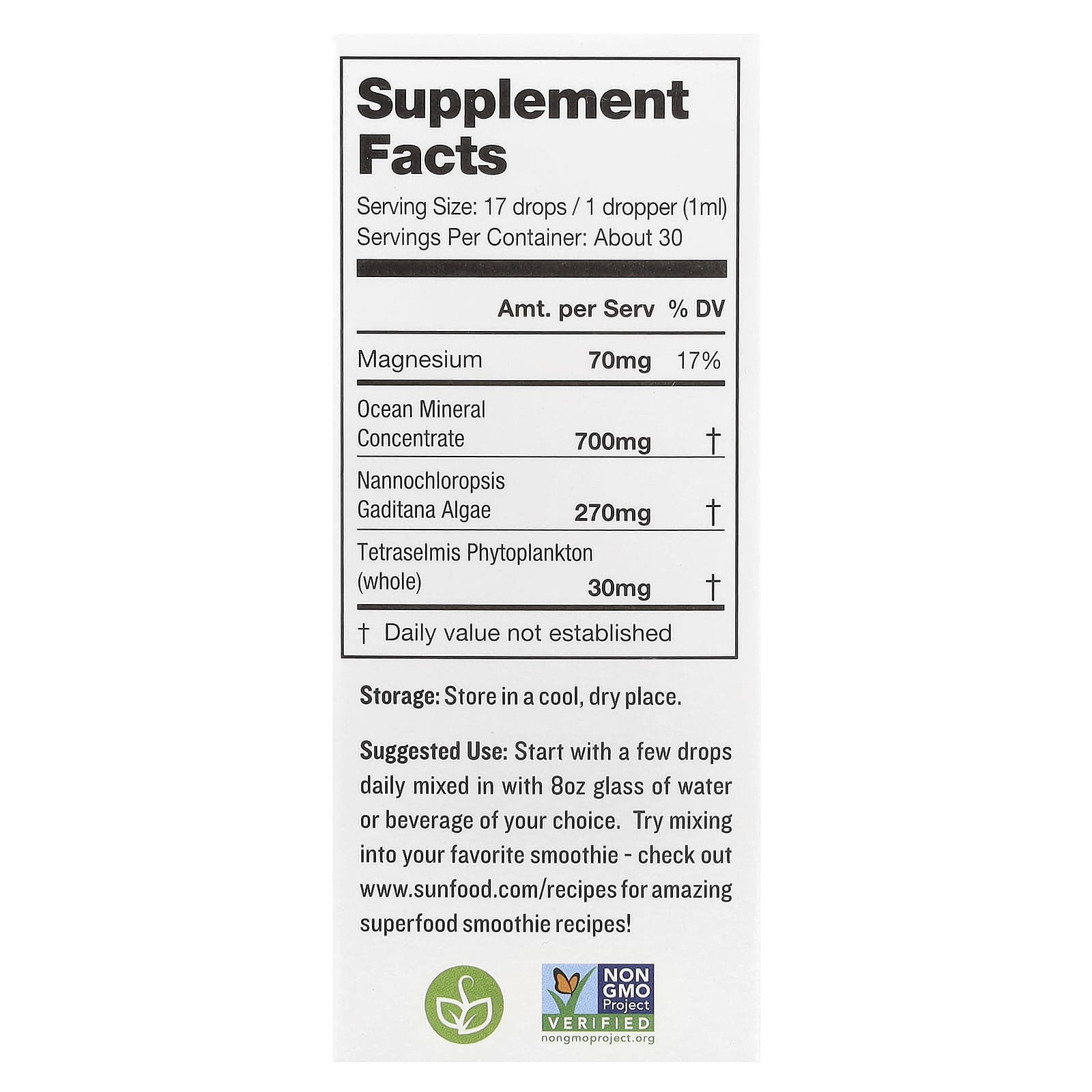 *Some information on the Sunfood, Essential Ocean Marine Phytoplankton, 1 fl oz (30 ml)label may be missing, or it may have been written incorrectly. We work hard to keep the information accurate & up to date. Please let us know if you discover any errors.