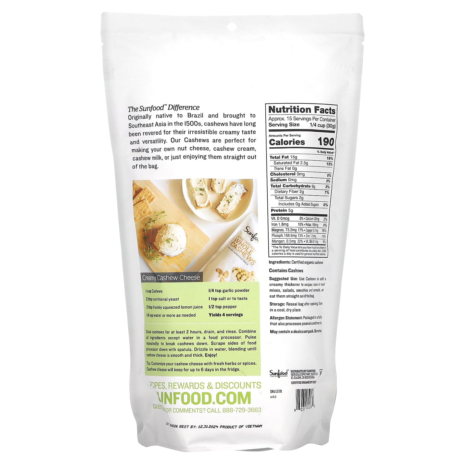 *Some information on the Sunfood, Raw Organic Whole Cashews, 1 lb (454 g)label may be missing, or it may have been written incorrectly. We work hard to keep the information accurate & up to date. Please let us know if you discover any errors.