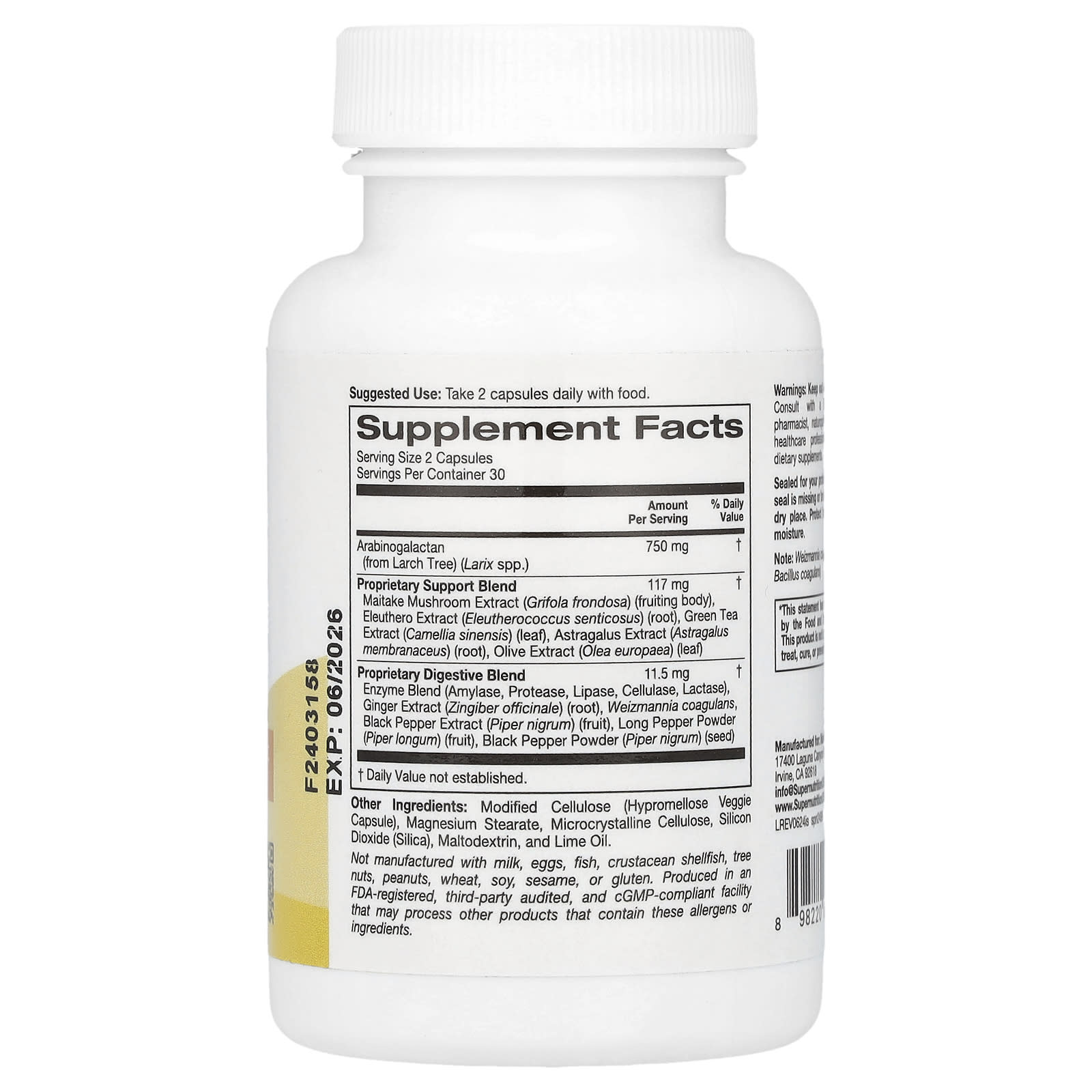 *Some information on the Super Nutrition, Immune Support, 60 Veggie Capsuleslabel may be missing, or it may have been written incorrectly. We work hard to keep the information accurate & up to date. Please let us know if you discover any errors.