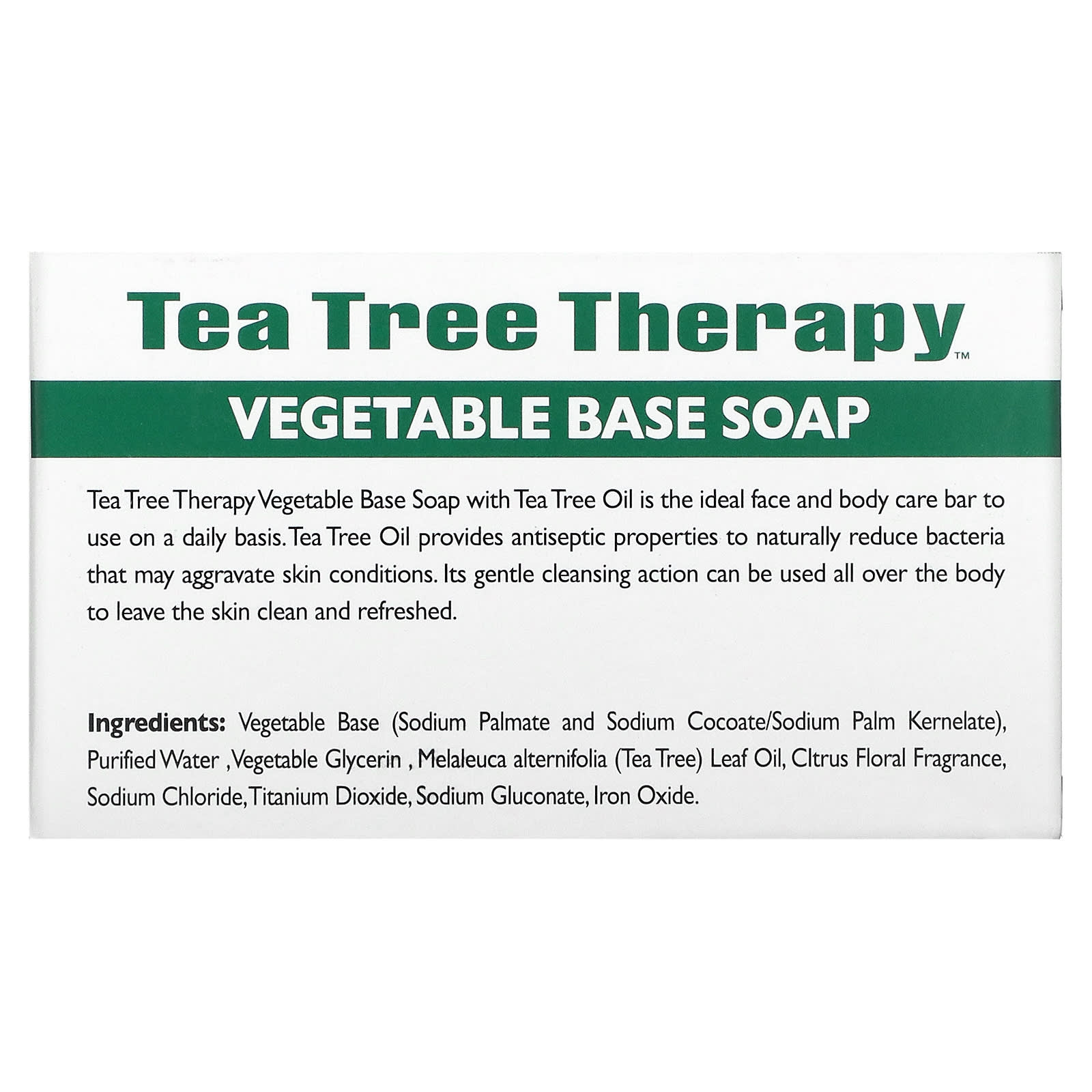 *Some information on the Tea Tree Therapy, Vegetable Base Bar Soap with Tea Tree Oil, 3.9 oz (110 g)label may be missing, or it may have been written incorrectly. We work hard to keep the information accurate & up to date. Please let us know if you discover any errors.