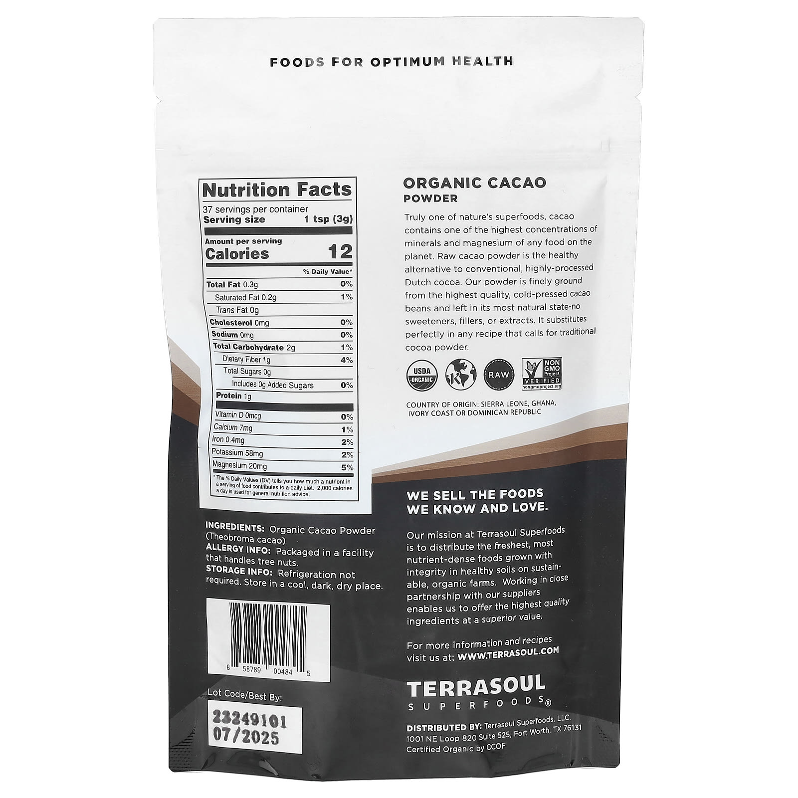 *Some information on the Terrasoul Superfoods, Cacao Powder, Cold-Pressed, 4 oz (113 g)label may be missing, or it may have been written incorrectly. We work hard to keep the information accurate & up to date. Please let us know if you discover any errors.