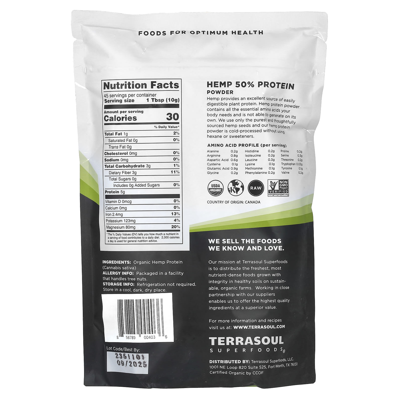 *Some information on the Terrasoul Superfoods, Hemp Protein Powder, 16 oz. (454 g)label may be missing, or it may have been written incorrectly. We work hard to keep the information accurate & up to date. Please let us know if you discover any errors.