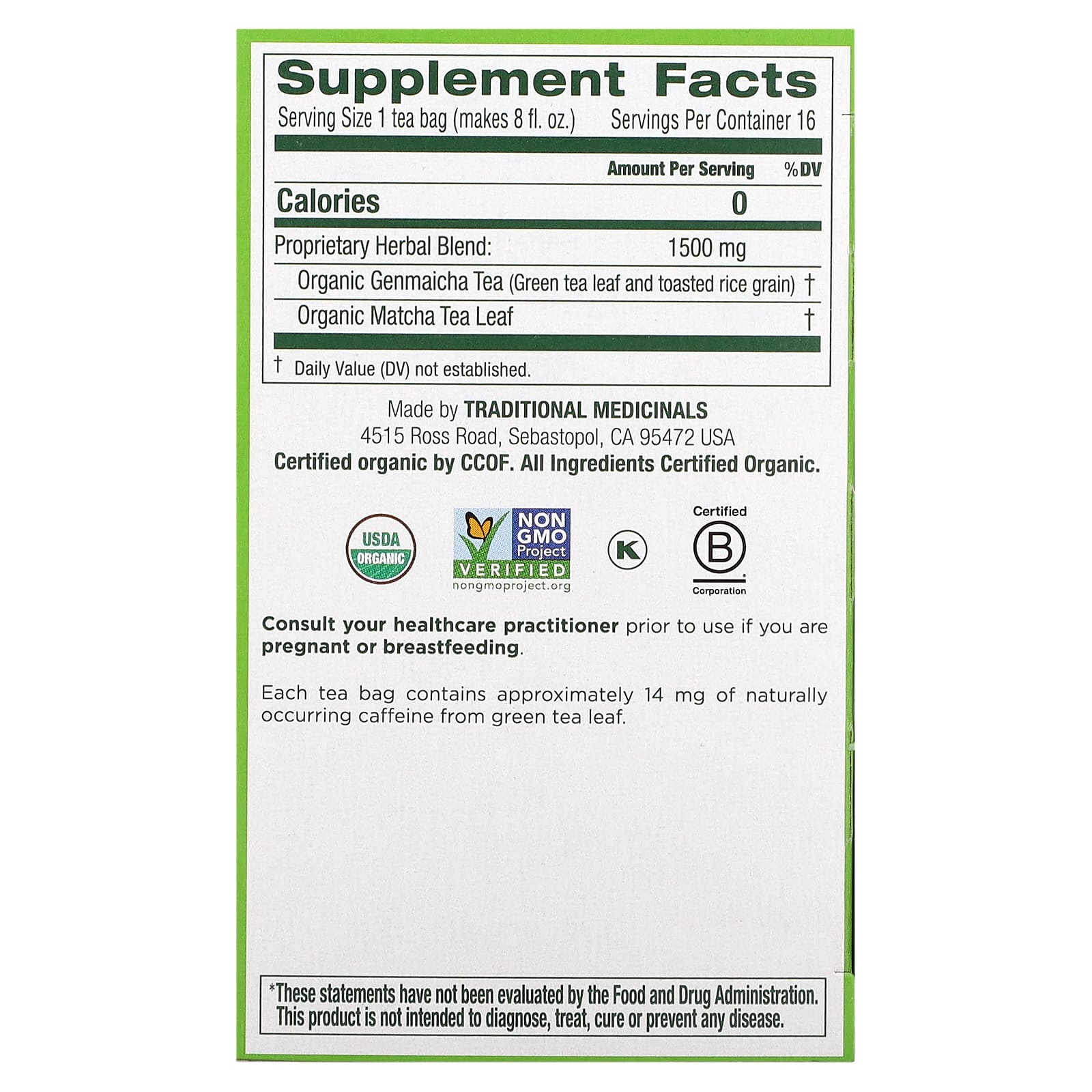 *Some information on the Traditional Medicinals, Organic Green Tea with Toasted Rice, Matcha, 16 Wrapped Tea Bags, 0.85 oz (24 g)label may be missing, or it may have been written incorrectly. We work hard to keep the information accurate & up to date. Please let us know if you discover any errors.