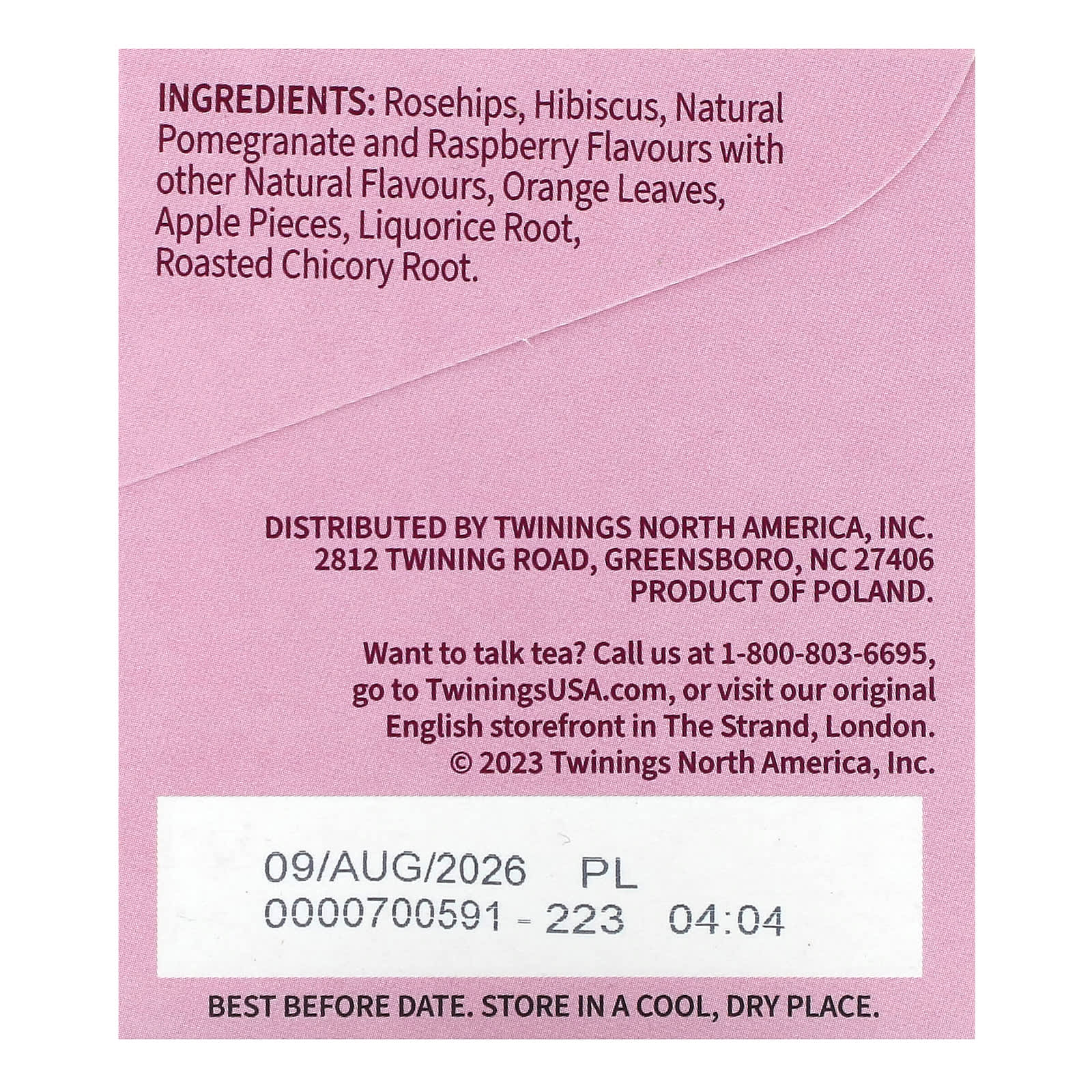 *Some information on the Twinings, Flavored Herbal Tea, Pomegranate & Raspberry, Caffeine Free, 20 Tea Bags, 1.41 oz (40 g)label may be missing, or it may have been written incorrectly. We work hard to keep the information accurate & up to date. Please let us know if you discover any errors.