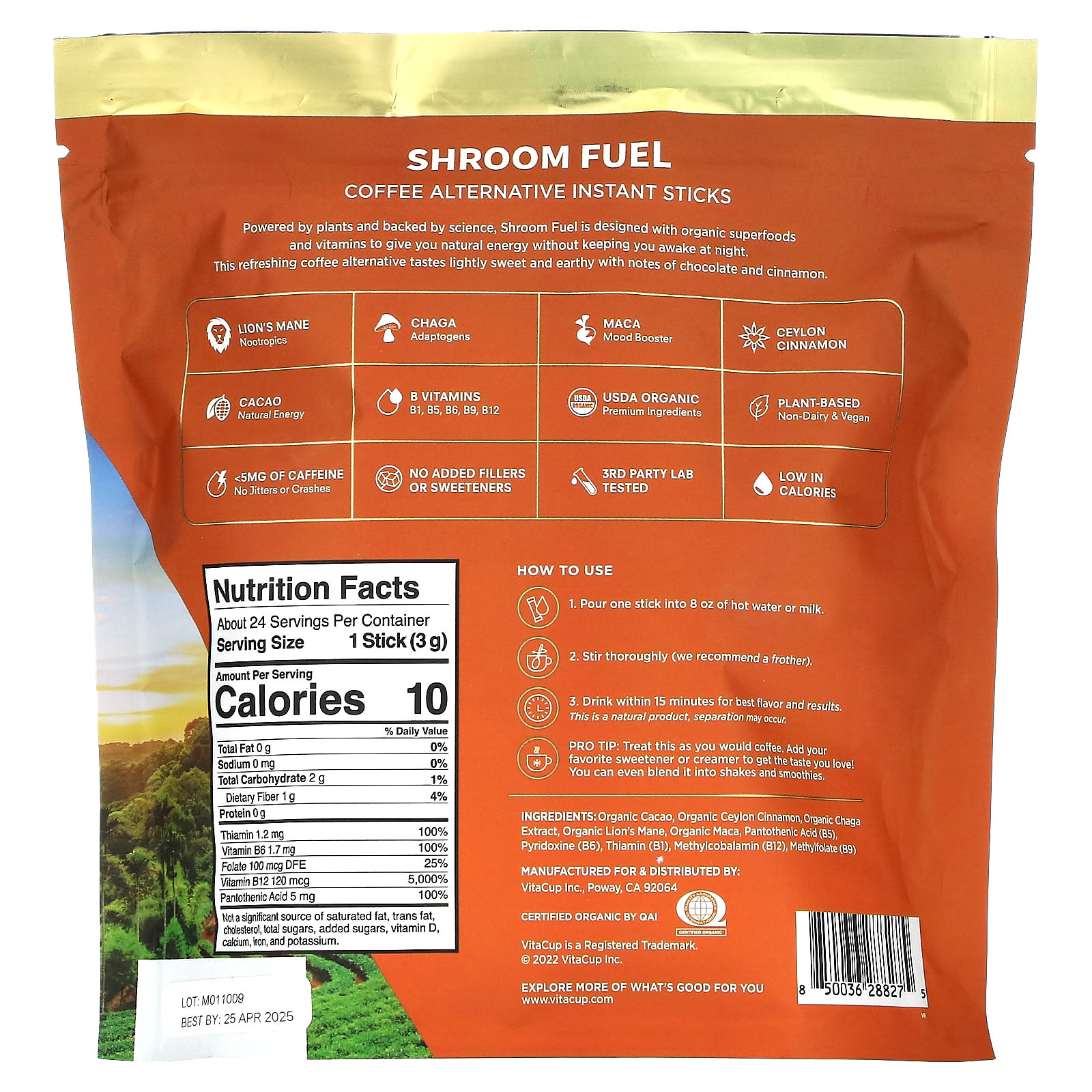 *Some information on the VitaCup, Shroom Fuel, Mushroom Drink Mix, 24 Single-Serve Sticks, 0.11 oz (3 g) Eachlabel may be missing, or it may have been written incorrectly. We work hard to keep the information accurate & up to date. Please let us know if you discover any errors.