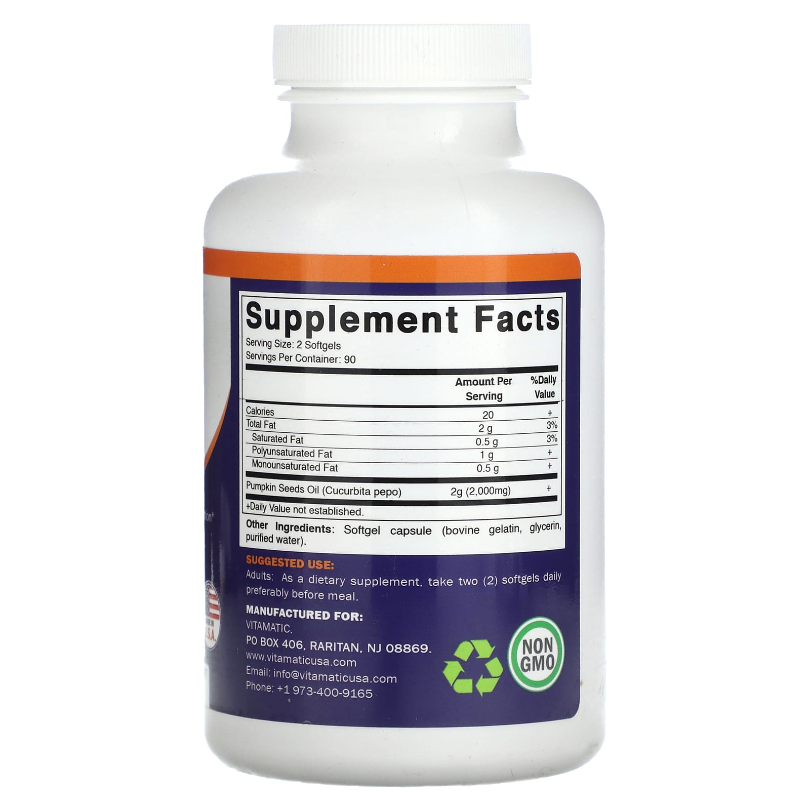 *Some information on the Vitamatic, Pumpkin Seed Oil, 2,000 mg, 180 Softgels (1,000 mg per Softgel)label may be missing, or it may have been written incorrectly. We work hard to keep the information accurate & up to date. Please let us know if you discover any errors.