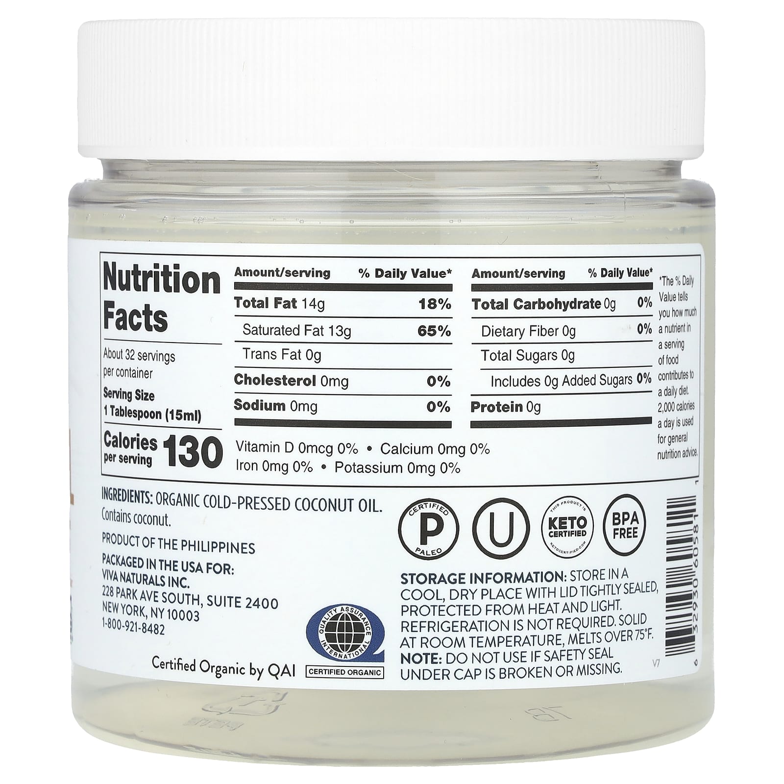 *Some information on the Viva Naturals, Organic Extra-Virgin Coconut Oil, 16 fl oz (473 ml)label may be missing, or it may have been written incorrectly. We work hard to keep the information accurate & up to date. Please let us know if you discover any errors.