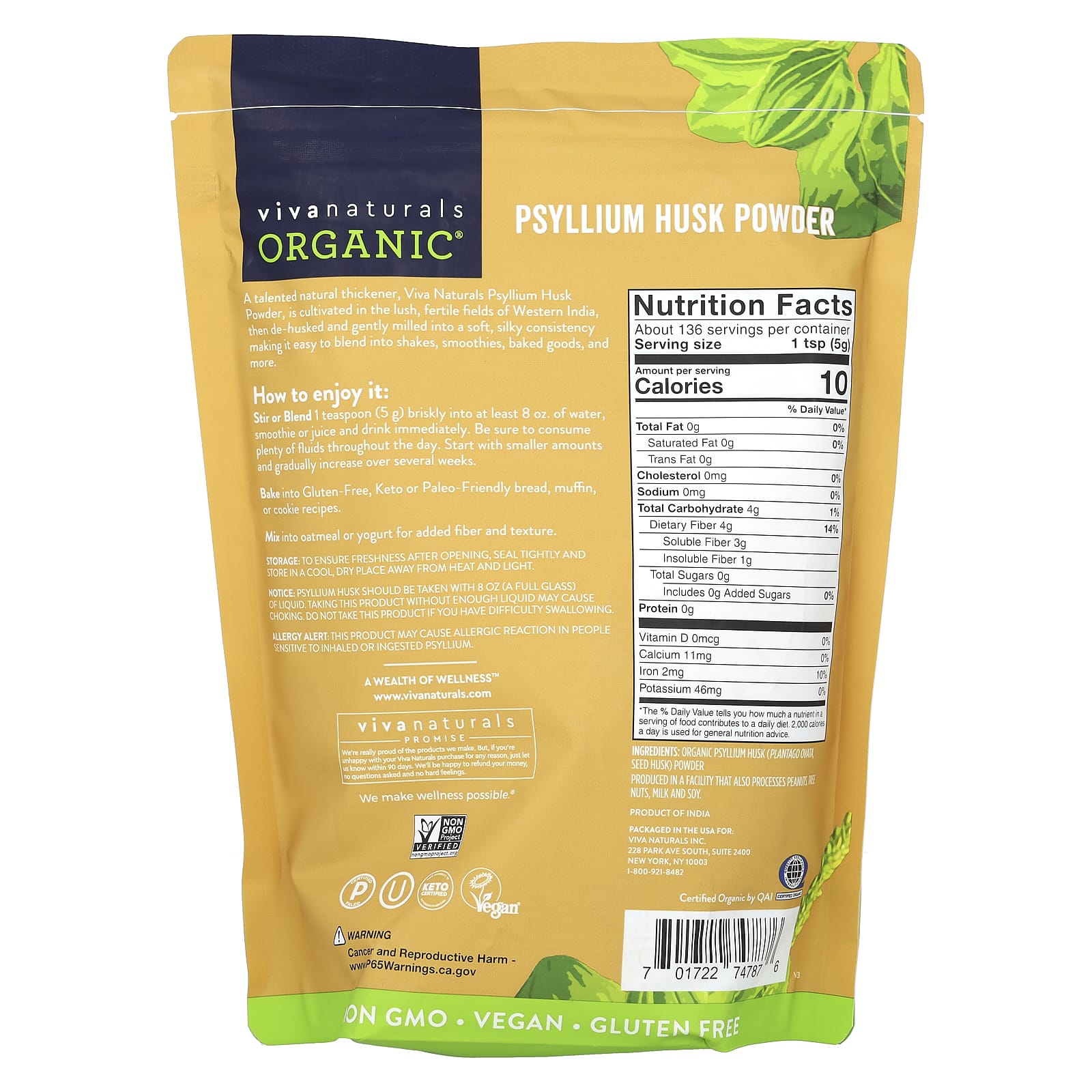 *Some information on the Viva Naturals, Organic Psyllium Husk Powder, 24 oz (680 g)label may be missing, or it may have been written incorrectly. We work hard to keep the information accurate & up to date. Please let us know if you discover any errors.