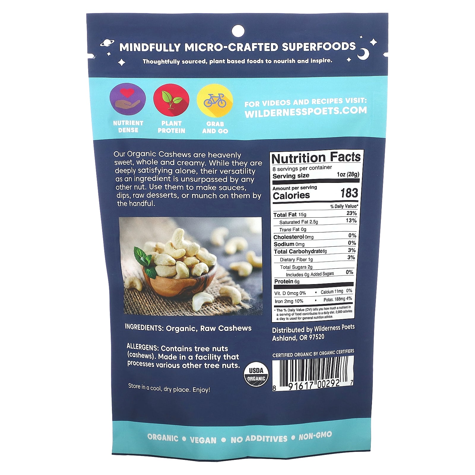 *Some information on the Wilderness Poets, Organic Whole Cashews, 8 oz (226 g)label may be missing, or it may have been written incorrectly. We work hard to keep the information accurate & up to date. Please let us know if you discover any errors.