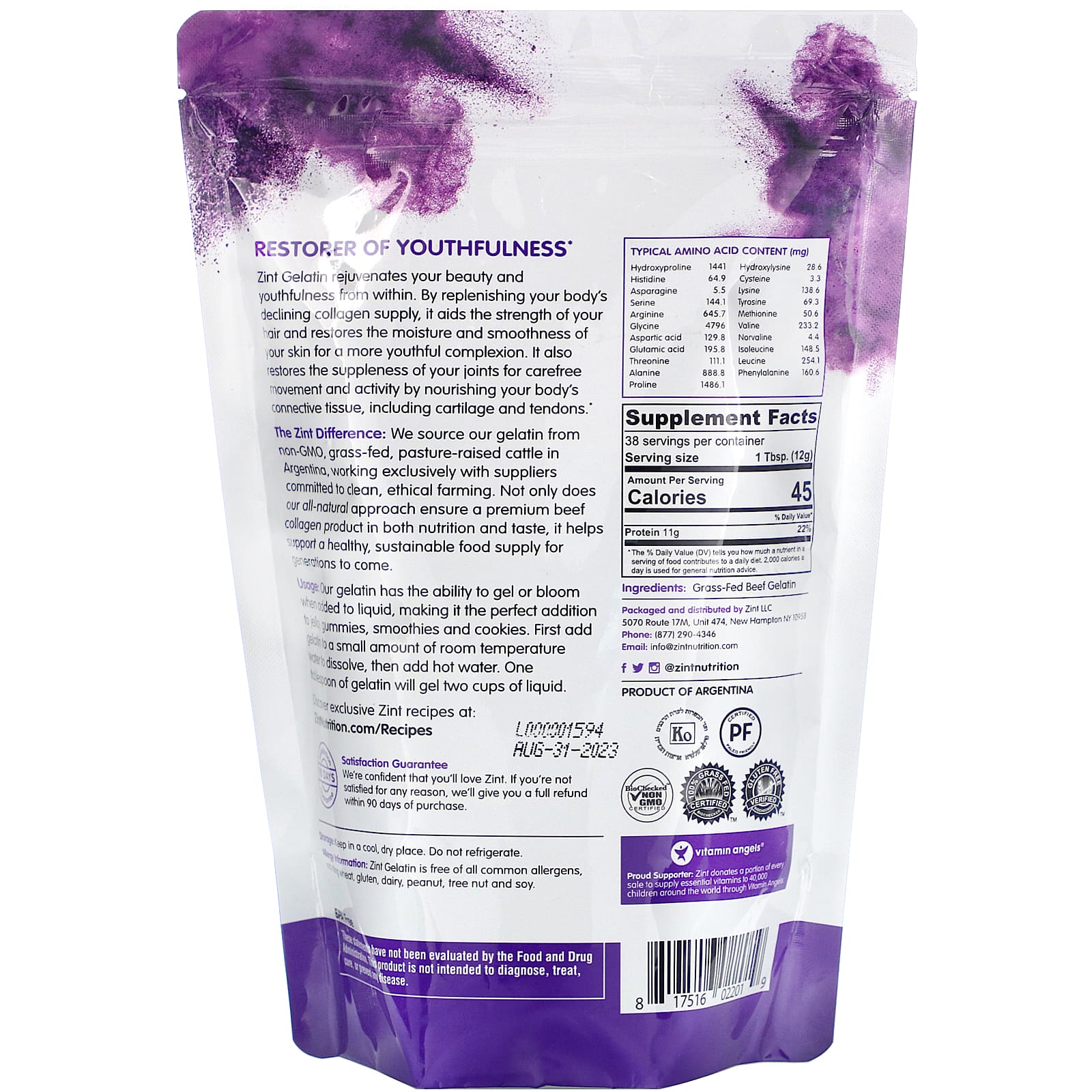*Some information on the Zint, Thickening Protein Powder Gelatin, Grass-Fed Beef, 16 oz (454 g)label may be missing, or it may have been written incorrectly. We work hard to keep the information accurate & up to date. Please let us know if you discover any errors.